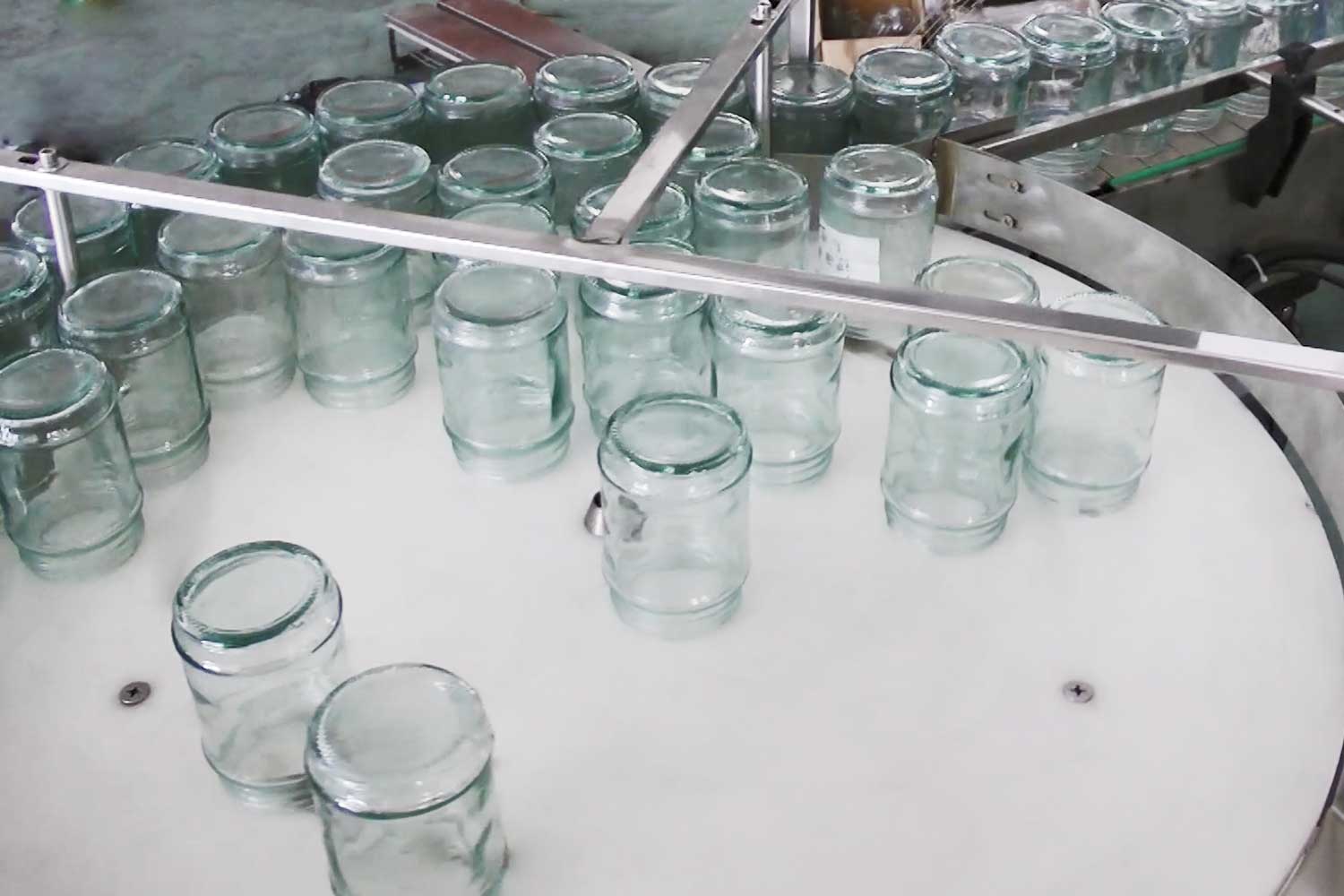 旋蓋機(jī)主要用于玻璃廣口瓶的三、四、六鐵蓋真空旋蓋,用兩根不同速度的皮帶壓瓶蓋,因兩根皮帶的速度不同,對蓋進(jìn)行搓蓋收緊達(dá)到旋蓋目的。在自動上蓋之前對瓶口吹蒸汽加熱,吹掉冷空氣,換上高溫蒸汽,立即旋蓋,根據(jù)熱脹冷縮原理,蒸汽冷下來就自然形成了瓶內(nèi)真空,達(dá)到了真空旋蓋的目的。自動旋蓋機(jī)可以和濃醬灌裝機(jī)、蜂蜜灌裝機(jī)、辣椒醬灌裝機(jī)組合在一起,形成一套全自動灌裝設(shè)備,是現(xiàn)代調(diào)味品企業(yè)的得力幫手。